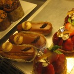 For lunch, I really like their hot-pressed paninis, cold sandwiches, and quiches. Their gelatos are also really good… soft, creamy, and made from fresh ingredients. It’s a good way to end lunch. Their tarts, puff pastries, eclairs and cakes are all beautifully crafted and I’m sure taste as good as they look. In the states, I don’t often go to a bakery to buy bread, but seeing many French people come here to buy all different types of fresh-baked loaves of bread to take back home, I decided to give it a try. Their bread is surprisingly inexpensive. I bought a large loaf of basil bread for only 1.2 euros, and it was absolutely amazing… soft in the center, chewy, and rich in basil taste. Their croissants are also really good.